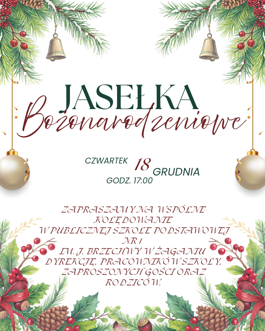 Serdecznie zapraszamy na jasełka przygotowane przez naszych uczniów, które odbędą się w dniu 18 grudnia o godzinie 17:00. Wspólnie przeniesiemy się w magiczny świat Bożego Narodzenia, by celebrować tę niezwykłą tradycję. Liczymy na Państwa obecność!